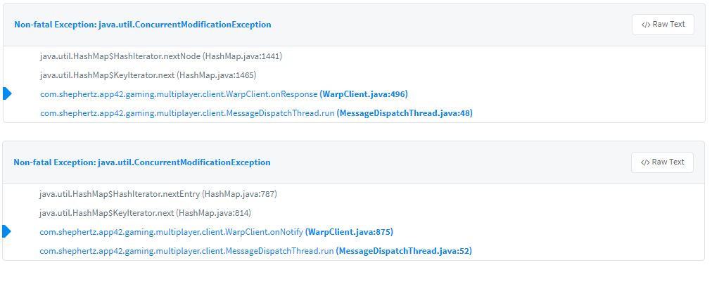We are getting ConcurrentModificationException in different parts of AppWarp code which is causing app crashes and with decompiled files it doesn't seem possible to figure out where exactly the issue is. Please find screenshots attached for the logs with exact line numbers.